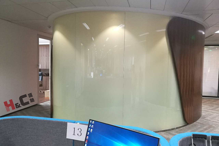 該辦公區域使用調光玻璃的地方很多,原來的一個大空間被分隔為幾個獨立的辦公室和會議室。平玻與彎玻相結合,弧形調光玻璃的圓角設計也與大樓的承重圓柱交相呼映,完美詮釋了高檔辦公室的內涵。