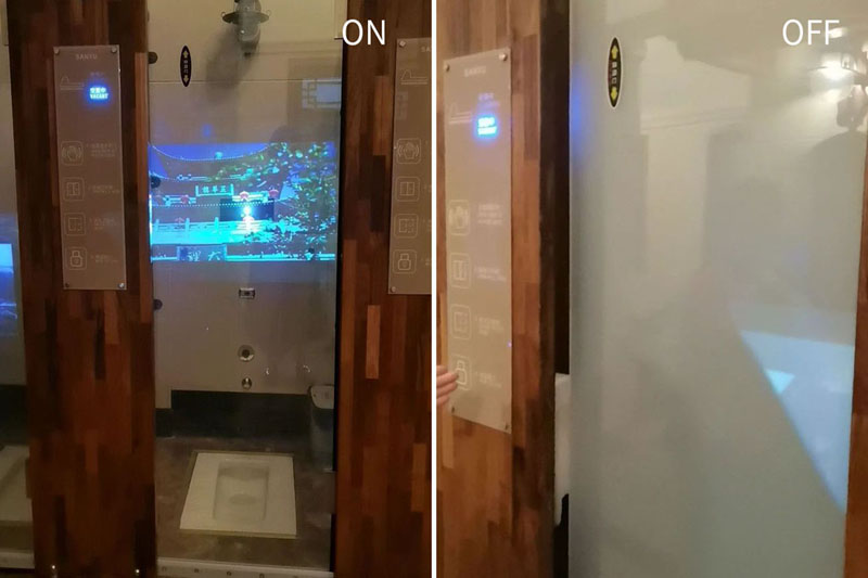 首先,讓人感觸最深的就是廁所的玻璃門,許多不了解的游客都看傻了眼,紛紛感嘆:要不要這么開放?透明的門怎么方便啊?其實(shí),這是連接了感應(yīng)控制系統(tǒng)的調(diào)光玻璃門。沒有人在里面的時(shí)候,玻璃門呈透明狀態(tài),讓人一眼就能看到有空位;當(dāng)有人進(jìn)入廁所關(guān)上門后,玻璃門就會(huì)由透明瞬間轉(zhuǎn)換為不透明的霧化狀態(tài),里面和外面都互相看不見,但玻璃的透光性良好,在里面的人不會(huì)感覺黑暗。