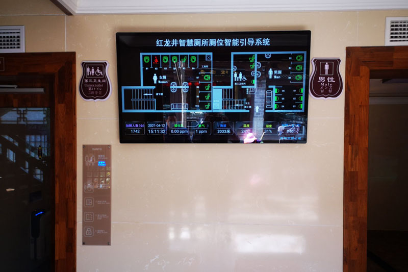 進(jìn)入公廁之后,就能看到正前方的墻上掛著一個(gè)電子屏幕,可以查看廁所內(nèi)的空間平面圖和各個(gè)廁所分布位置,還可以通過紅綠色的標(biāo)志查看廁位是否正在被使用,有效避免廁所擁擠和排隊(duì)的情況。